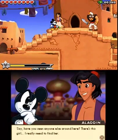Aladdin can be rescued in Agrabah, near the beginning of the level at the top of the first set of stairs. Mickey will need to Paint him in to rescue him. Afterwards, he will assist Mickey by throwing fruit at his enemies, and at the end of the level he will return to the Fortress and set up his own room, handing out quests to Mickey.