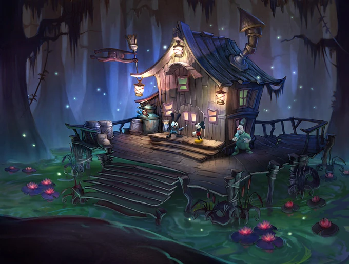 Upon returning here from Lonesome Manor, Mickey can talk to Bertrand to trigger the Help Bertrand Open His Store Quest. Once the Quest is completed, the store is open for business. The shop sells health, Sketch, and Paint/Thinner upgrades, as well as the Lonesome Manor pin and Bog Easy Extra Content. Animatronic Donald's lost parts are sold for 1,000 E-Tickets each if they were not collected in Lonesome Manor.