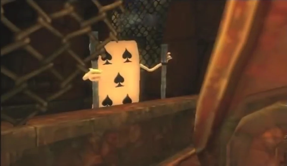 He is very good with machines and opens the Mickey Mouse Lunch Box that leads to The Piles. He tells you to restore the TV's to repair the crane and says that the Bunny Children are not your enemies. Instead of painting the TV's you can also free a gremlin who will repair the crane, either way the gate opens and neither are bad choices. He also seems to take care of the bunny children when Oswald isn't around. Also, he is one of the only two playing cards (the other one being Jack Trade) that likes you from the start.
