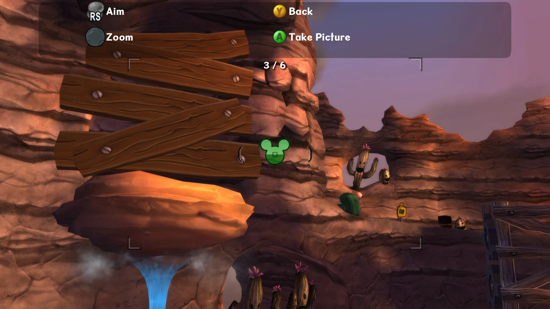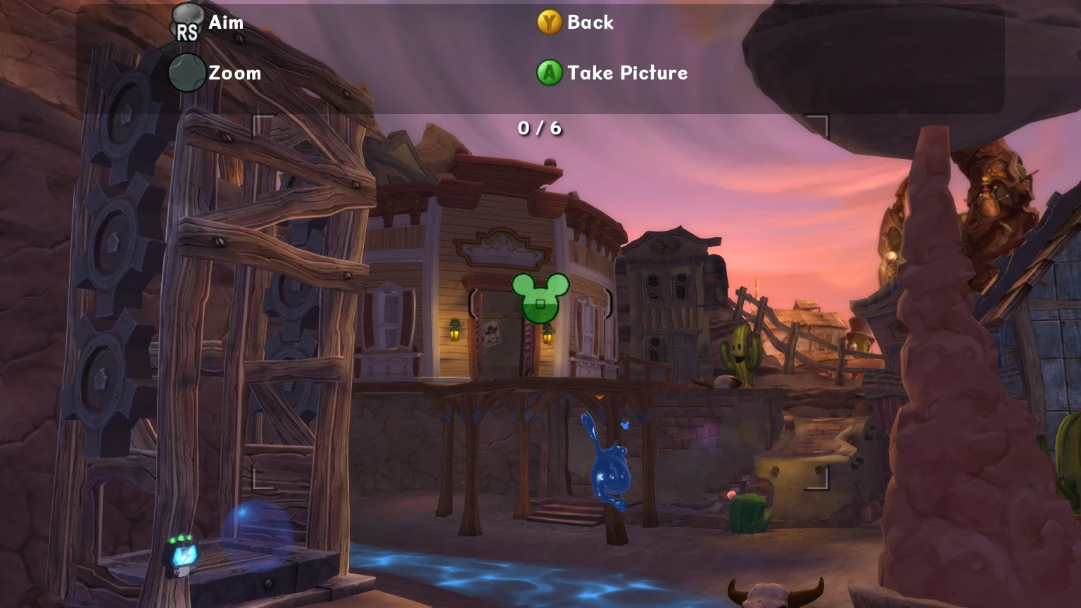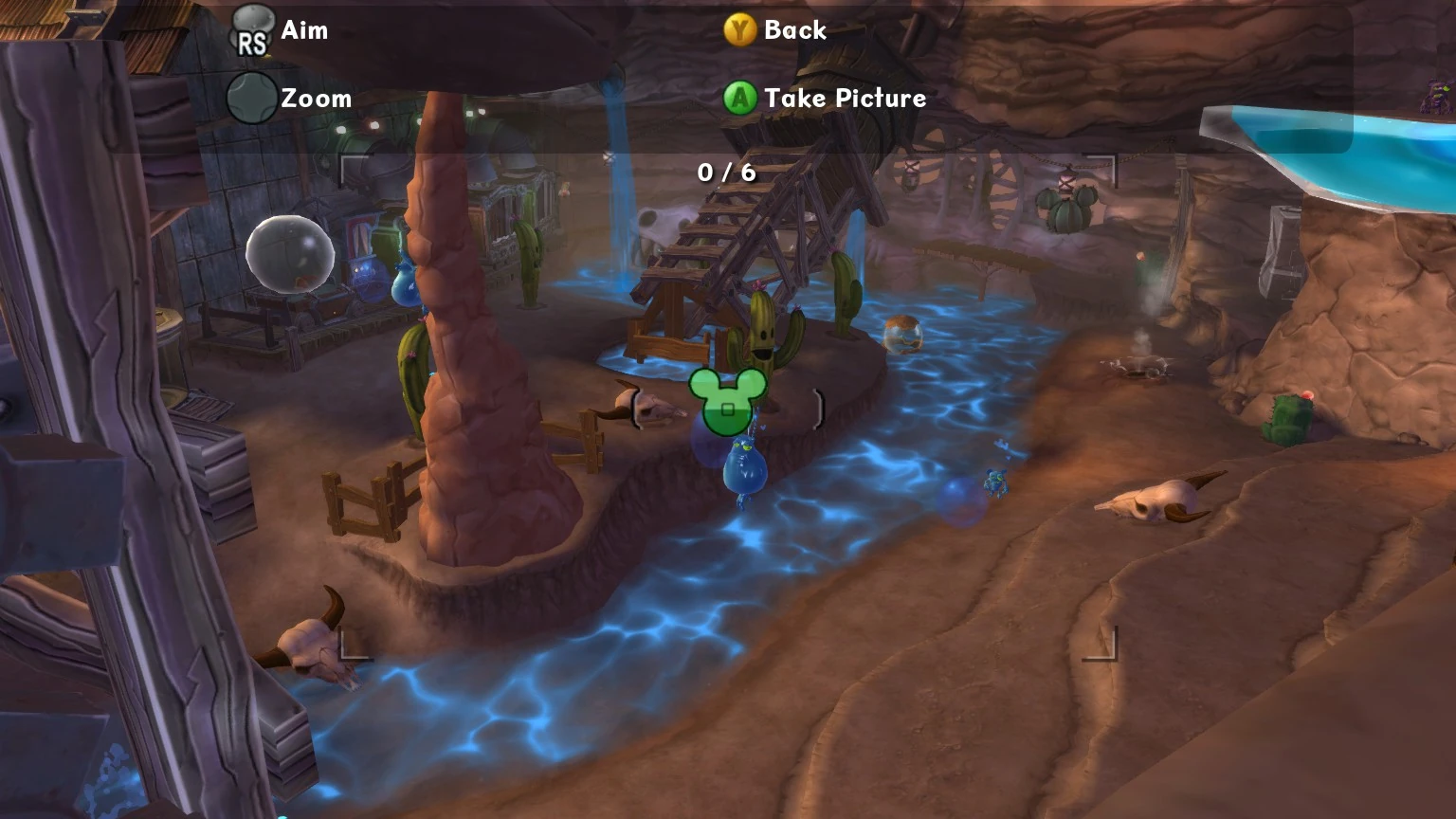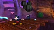 - Gremlin Griff - There is a Gremlin Cage behind a couple of wood bars in a nook in the wall. To access it paint in the cow skulls to plug up the geysers, this will cause all the air to push the rock making it a platform allowing Mickey to now access the Gremlin, he turns off the Spatter Tube when freed.