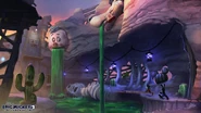 This area is surrounded by a rock wall. On the north side there is a Projector and a D.E.C. to Angel/Devil Caverns. The projector is on a higher platform and can only be accessed by using the elevator when shocked. A large guardian pool flows through the area. On the west side is a dinosaur skeleton and the train. On the east side is a saloon. In the center is a water tower and a pile of rocks with a spinning rock on top. The area has multiple cow skulls and cacti. In the northeast is a rock on a geyser under a nook in the wall boarded up with Toon planks with Gremlin Griff trapped in it.