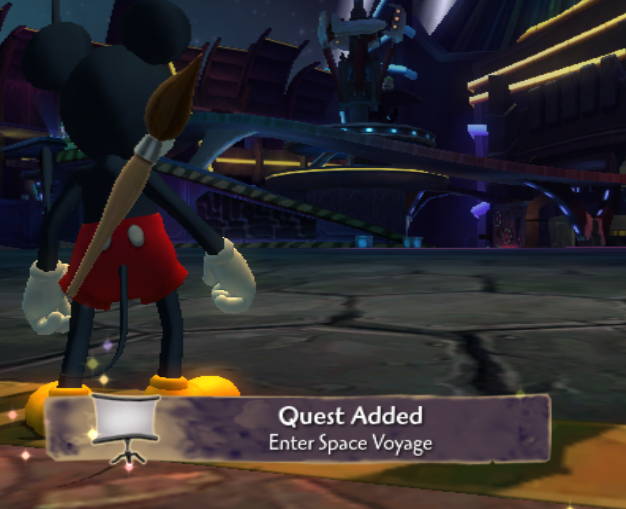 Enter Space Voyage is a quest given to Mickey by Gus in Tomorrow Square. Mickey must restore power to the people mover in order to open the way to Space Voyage. There are two ways to proceed: powering the people mover with TV Sketches or freeing Gremlin Nova.