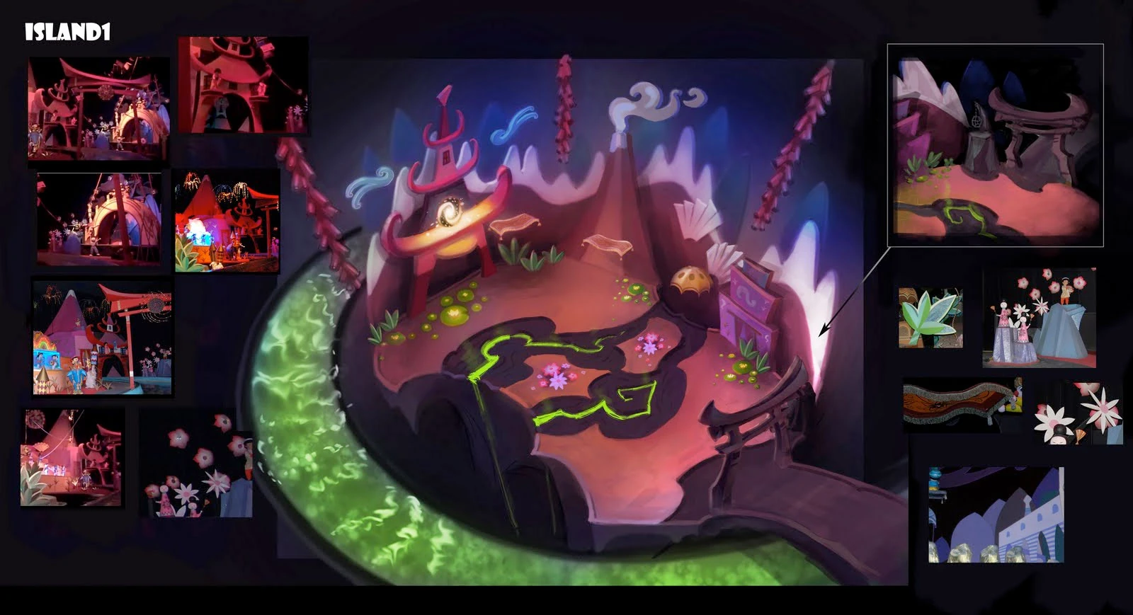 After passing through a small backstage area, Mickey will arrive in the Asia Boat Ride. Here, Mickey will find many iconic landmarks, including the Taj Mahal of India and the pagodas of Japan. The fire bridge lies submerged beneath the Thinner flow, and magic carpets frequent the area.