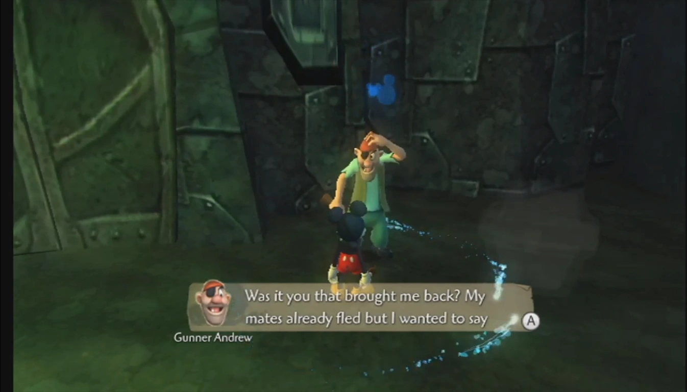 Andrew is standing besides the Pirate Conversion Machine, but only if Mickey fills up the attached pumps with paint causing the Beetleworx pirates to revert back to normal. His crewmates have already left, presumably to Tortooga, but he stays behind to thank Mickey for saving them. Besides him is a treasure chest containing a special pin.