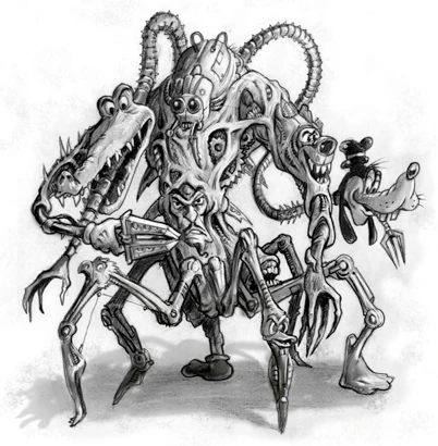 In the concepts, they had a spider-like Spinner on top, a Goofy head tithe a mini trident on one of the pipes, a Tick-Tock head on the other pipe-arm, a Jafar head in the middle, an equine mouth with square teeth on the side, a Donald Duck head on one of the legs, a Donald foot on another leg, a boot on the central leg, a Jose Carioca head on yet another leg, a Mickey glove wielding a two-pronged tool one one arm, and a demonic Tigger-like head on another. There appears to be a fleshy outer coat as well. There was also another variation as well, with the only recognizable part being the Mickey ears.