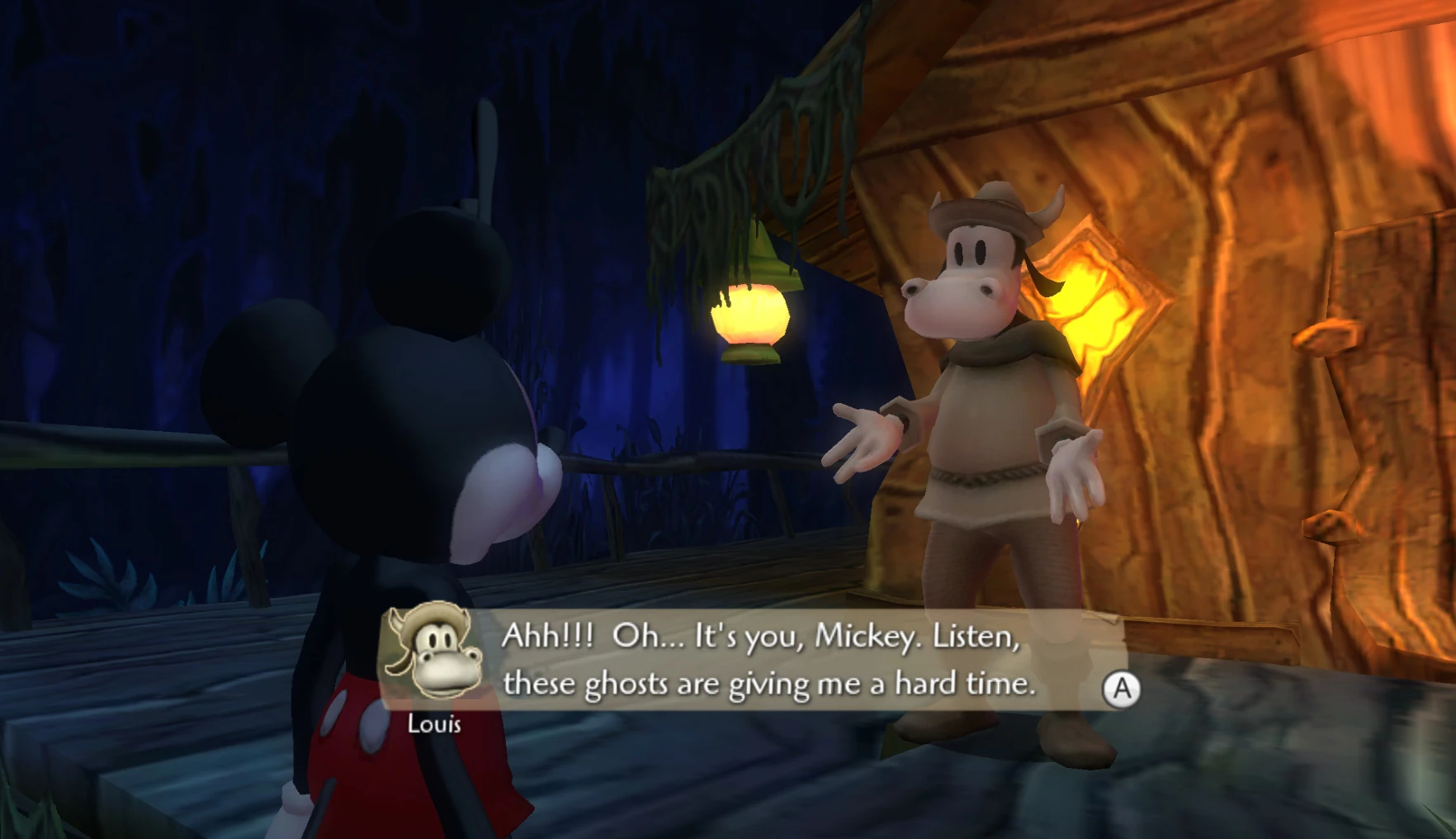 Louis is in his shack in Bog Easy. If Mickey in his first visit to Bog Easy talks to Louis, Louis will refill his ink and health and then will tell Mickey to return for a mission. If Mickey returns Louis will ask Mickey to destroy the Jug Band because the Ghosts have been using it to bother the citizens of Bog Easy. If Mickey does destroy it by spraying thinner in the funnel on the top of it Louis will gift him with a Music to My Ears Pin.